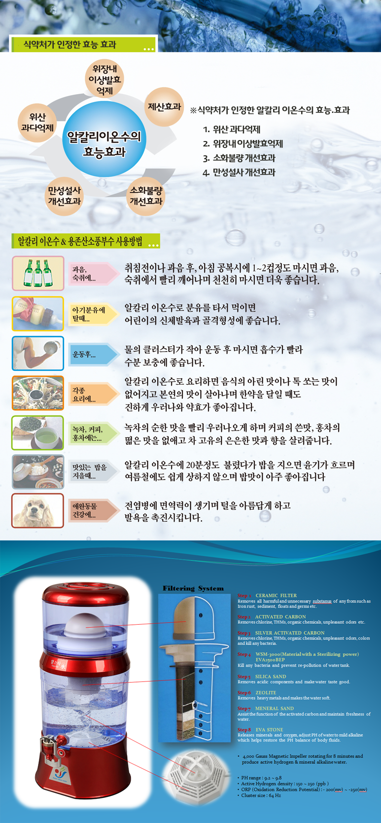 • 전기분해 방식이 아닌 천연 알칼리 미네랄을 음용수에 환원시킨